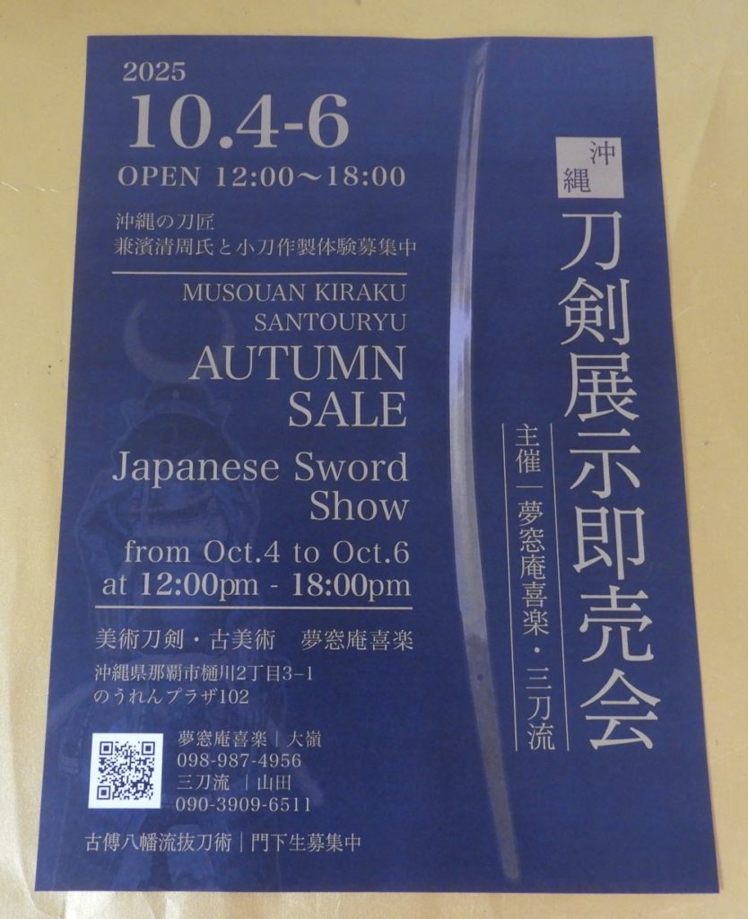 令和7年10月4日,5日,6日、夢窓庵喜楽&三刀流、沖縄刀剣即売会、開催! JAPANESE Sword Show Oct 4to6