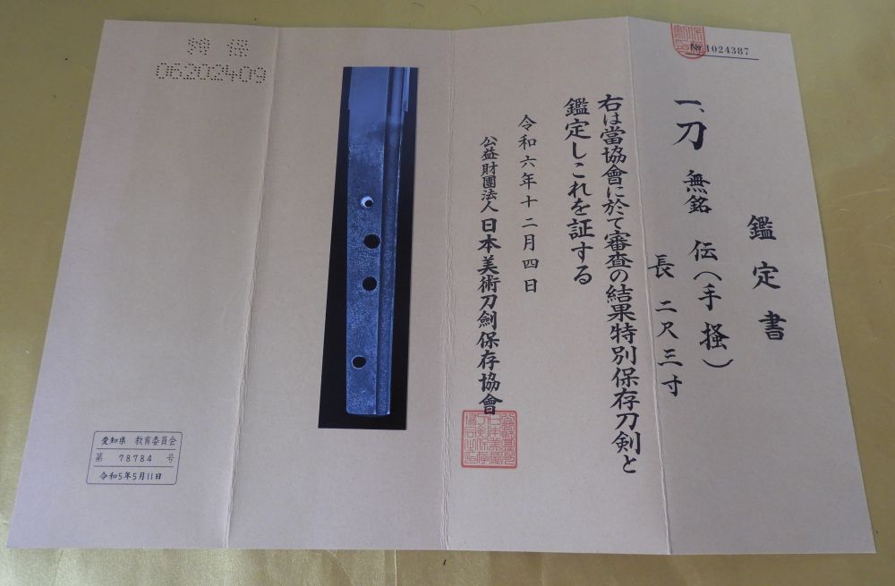 | 寸法 | 刃長:69,0cm 反り:1,6cm 元幅:3,0cm 元重:0,6m 先幅:2,3cm 先重:0,45m 目釘穴:4個 |