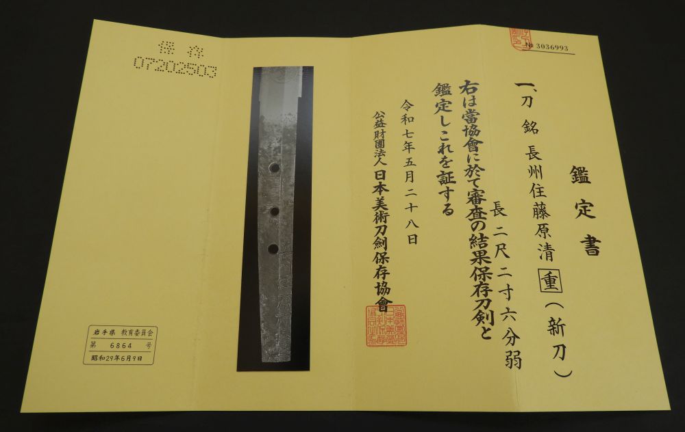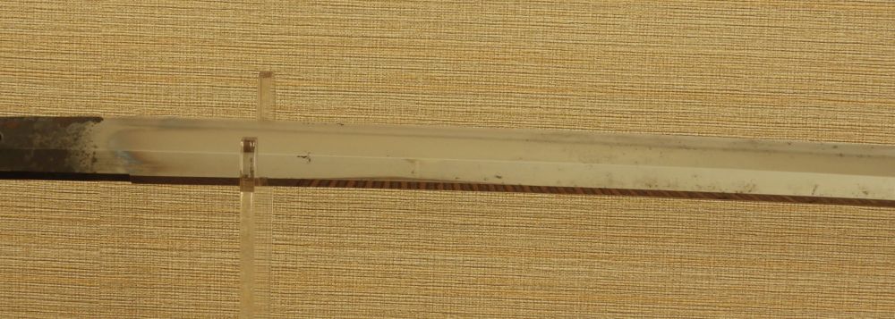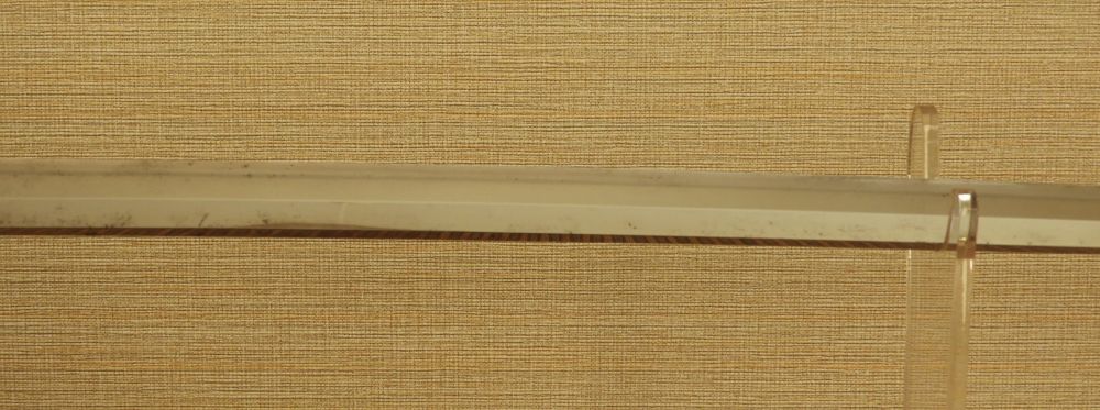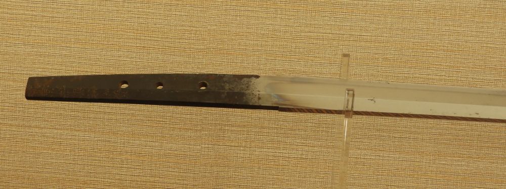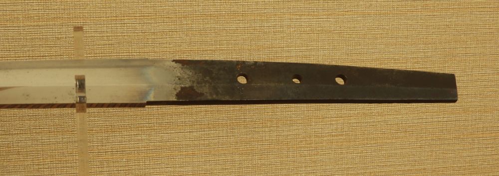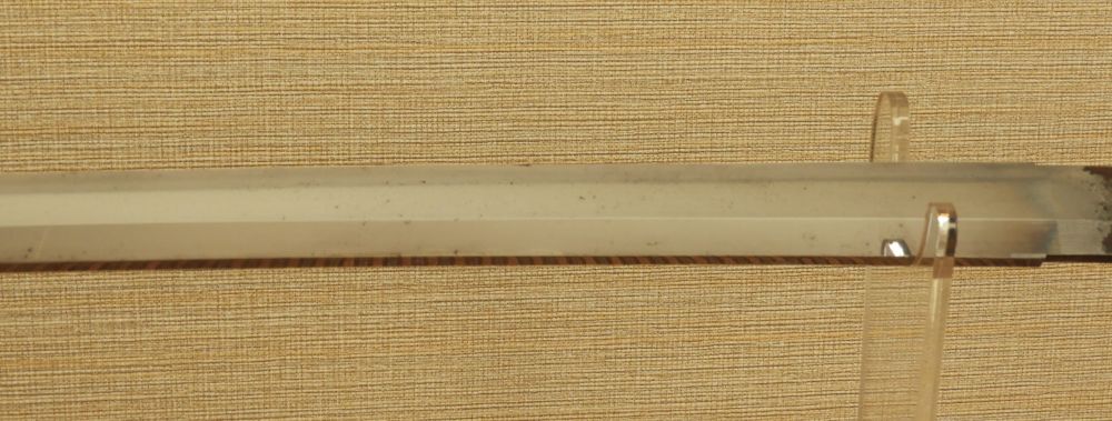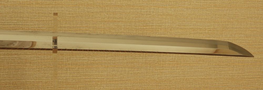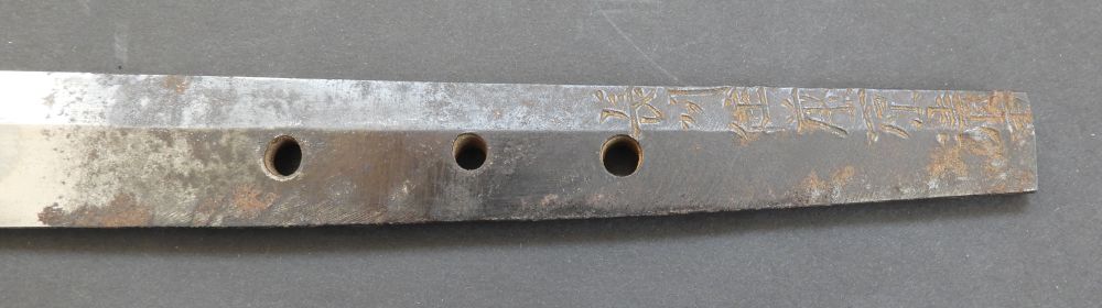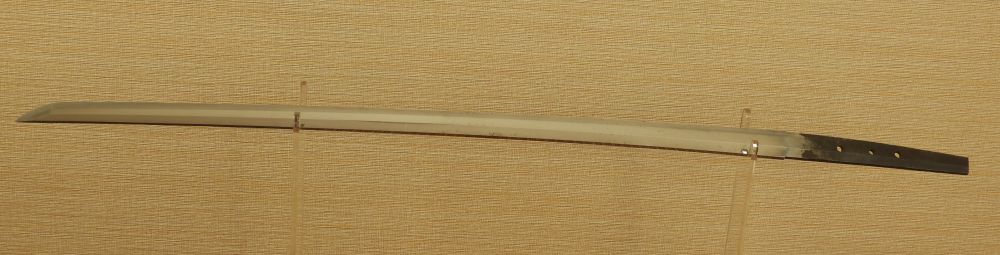 | 寸法 | 刃長:68,7cm 反り:0,6cm 元幅:2,8cm 元重:0,6m 先幅:2,2cm 先重:0,5m 目釘穴:3個 |